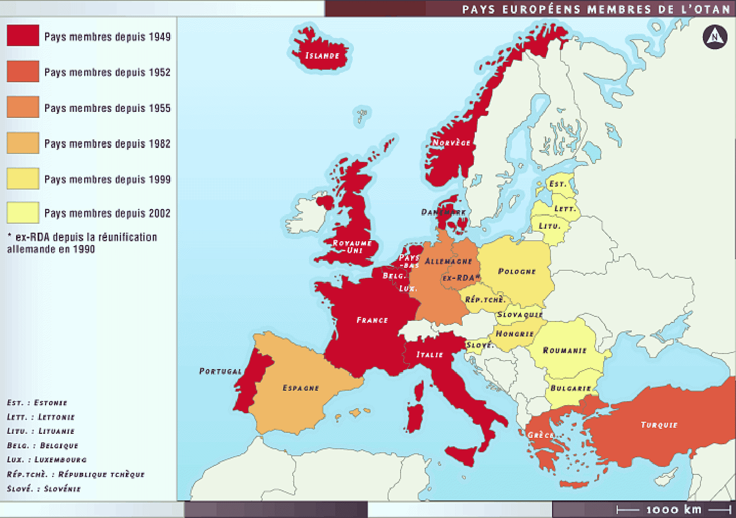 L’Organisation du Traité de l’Atlantique Nord fut créée en 1949, pour circonscrire l’U.R.S.S. et unir l’Amérique du Nord et l’Europe de l’Ouest par un traité de coopération militaire. De 12 pays fondateurs, nous en sommes à 30, et son influence s’étend jusqu’aux frontières de la Russie suite au ralliement des anciennes républiques socialistes.