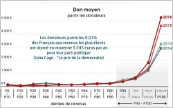 Le financement de la vie politique est aussi à revoir selon Julia Cagé (16) car la part des fonds privés augmente beaucoup par rapport au public et aux cotisations des adhérents, avec une défiscalisation avantageuse. Il y a là une perte de la démocratie au détriment des gens démunis par rapport aux riches qui, pour la plupart financent des partis de droite.