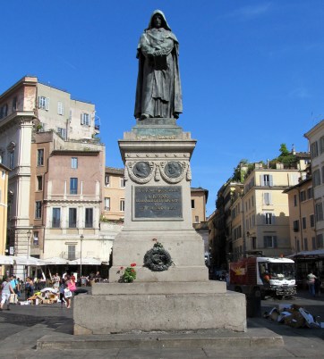 Le 16.02.1600 Giordano Bruno est condamné pour hérésie et brulé vif en public sur le Campo di Fiori. Encore aujourd’hui l’église n’a pas reconnu sa culpabilité d’avoir condamné Bruno (tout au plus n’aurai t’il pas fallu le bruler). Cette mort par crémation a été niée, puis reconnue véridique et a fait l’objet de vives polémiques, encore actives de nos jours.