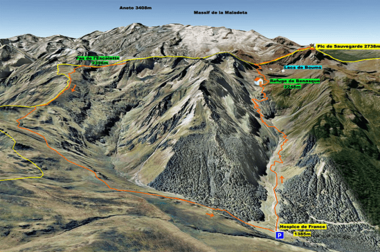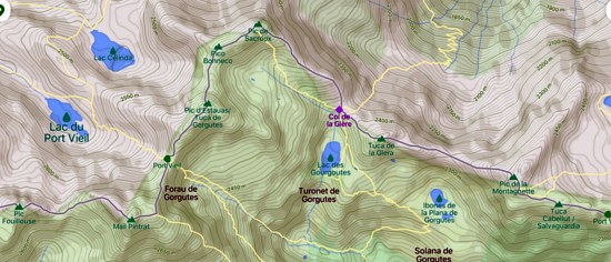 Départ du refuge, remontée vers le port de Vénasque, puis direction le port Vieil (2846 mètres) en passant en bas des pics de Sauvegarde, de la Montagnette et de la Glère. Ensuite descente vers les lacs de Célinda, Charles et Bleu, vers le refuge du Maupas