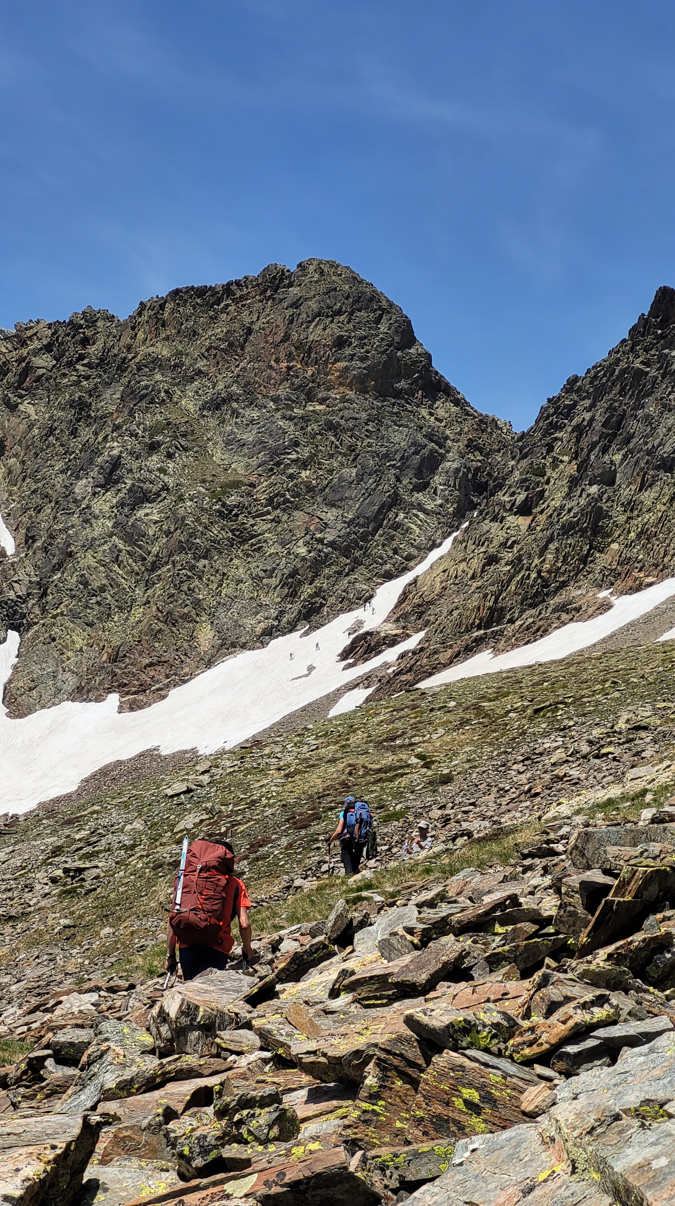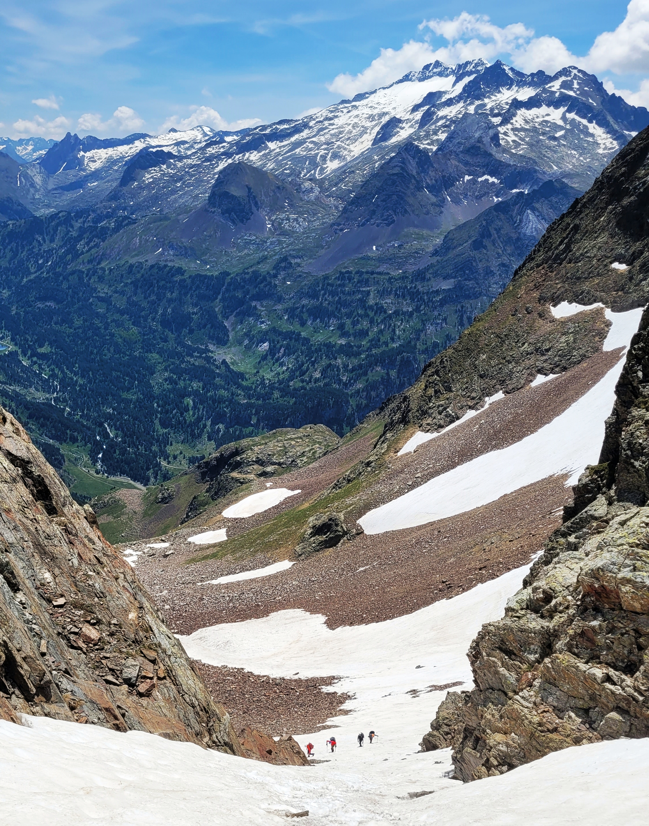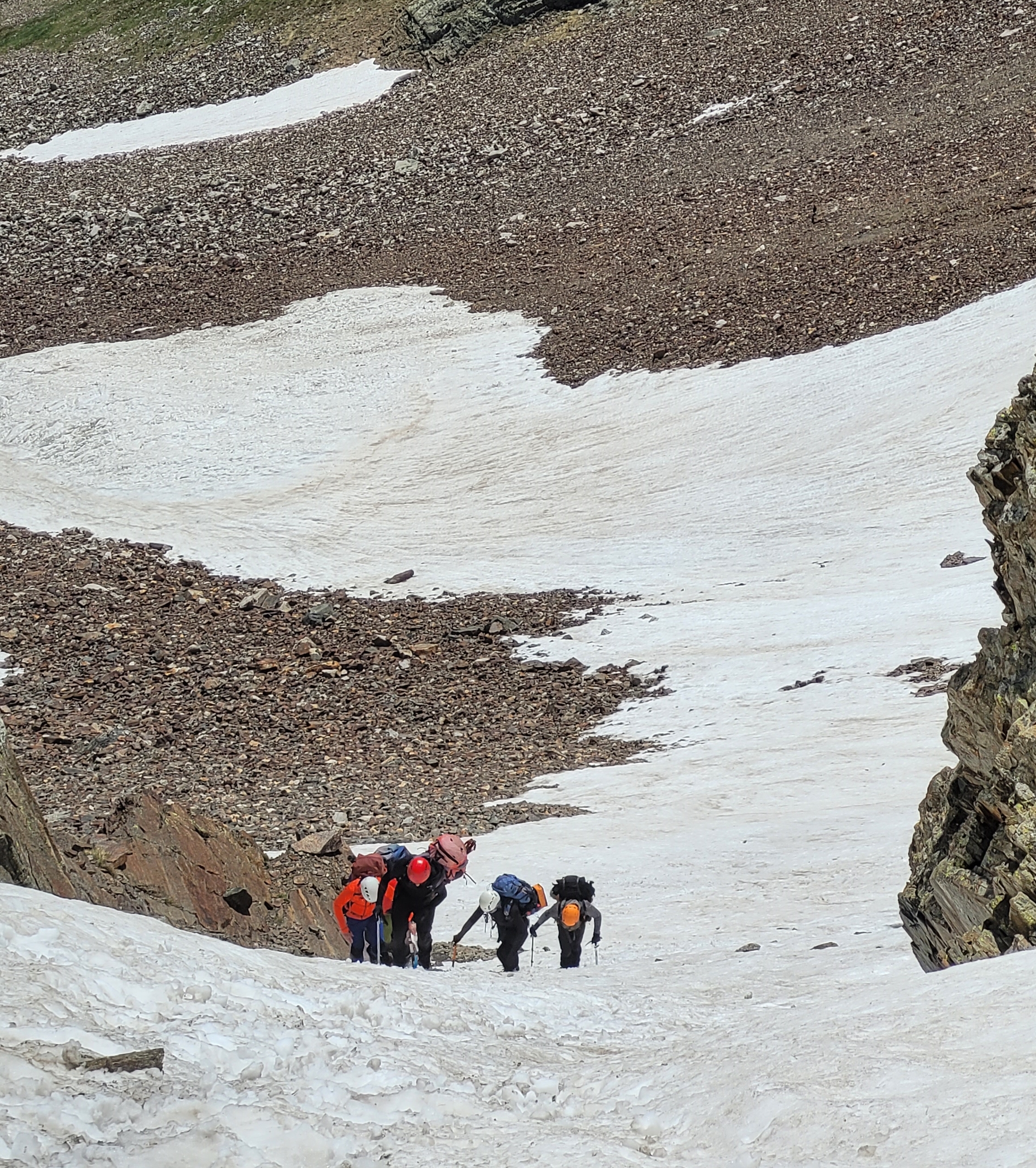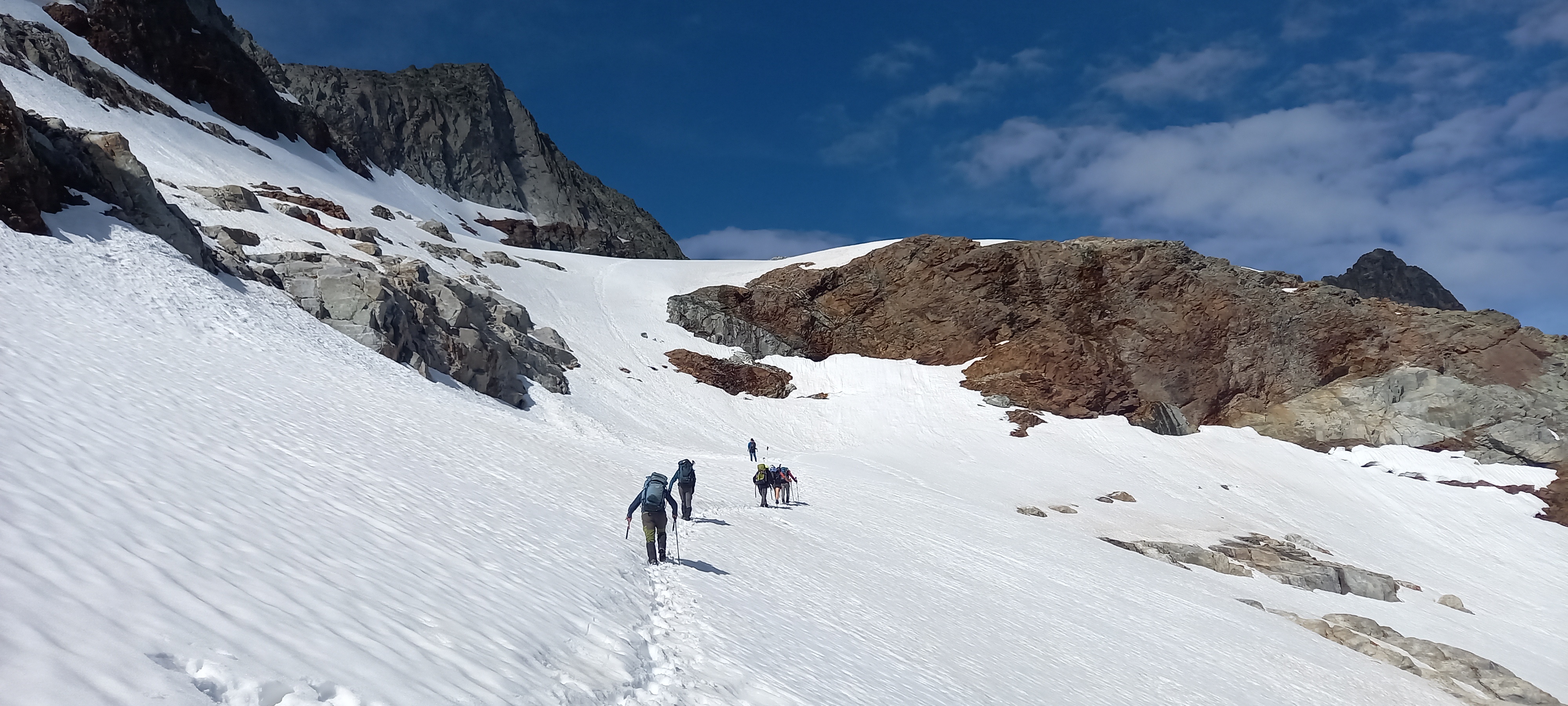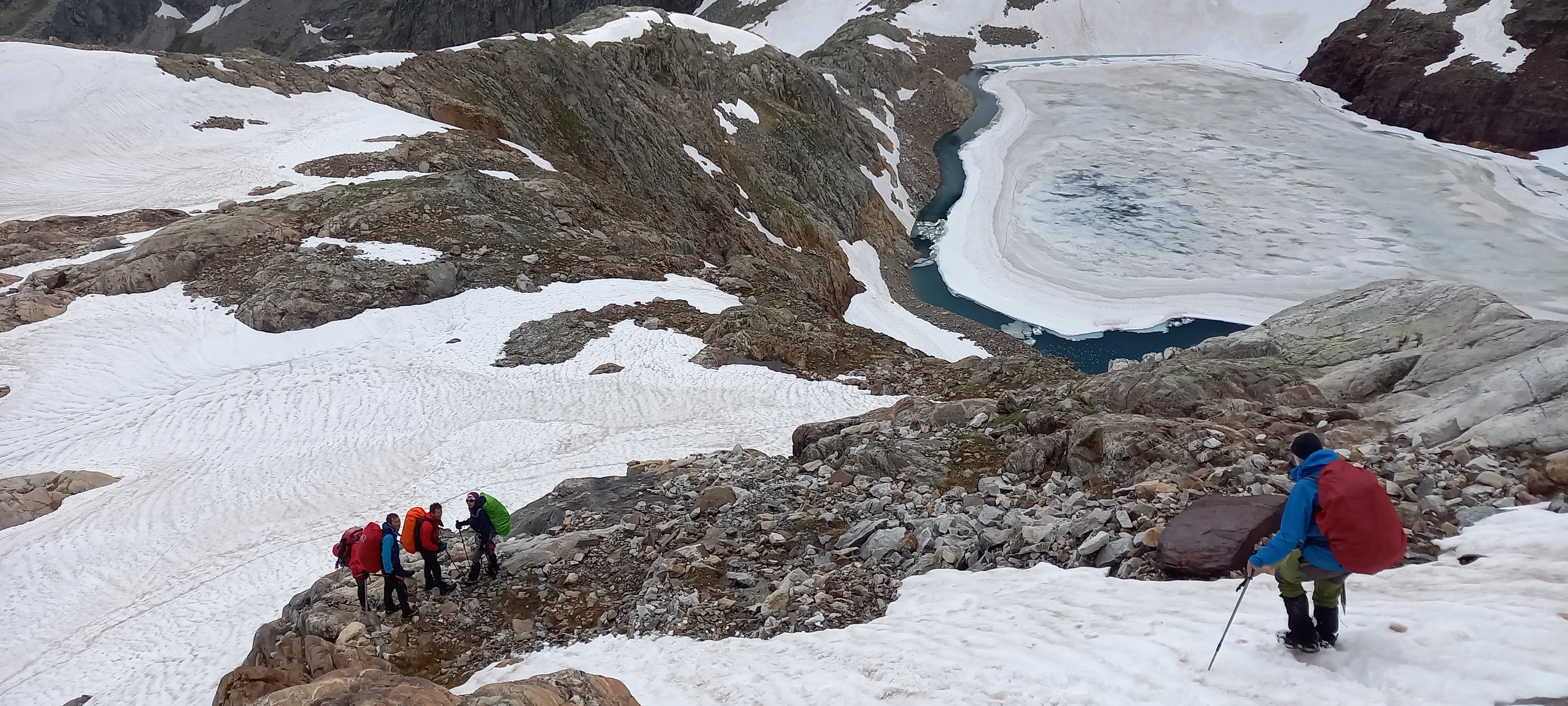Départ pour les pentes neigeuses et le col des Crabioules (3012 mètres), la vallée et le col de la Literole, puis descente au cirque du Portillon.
