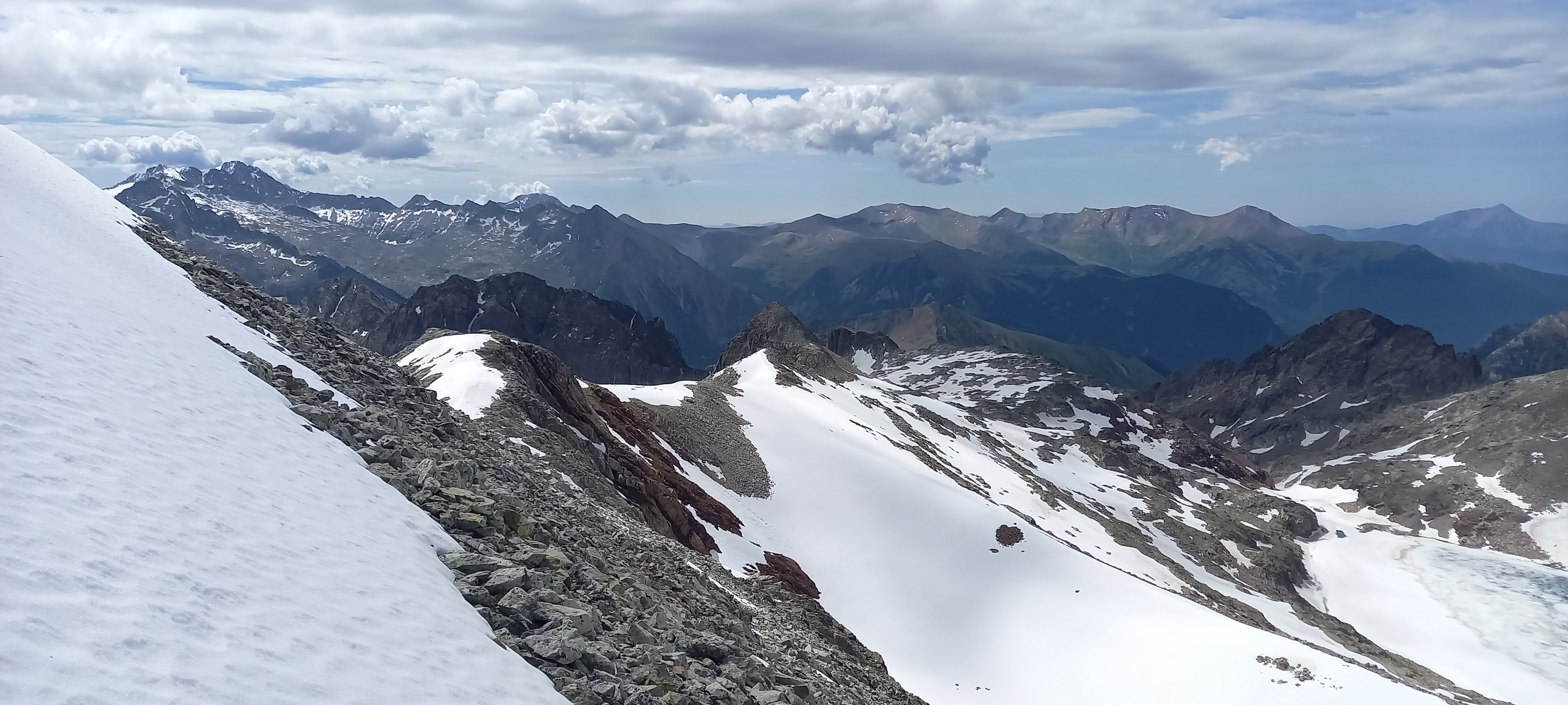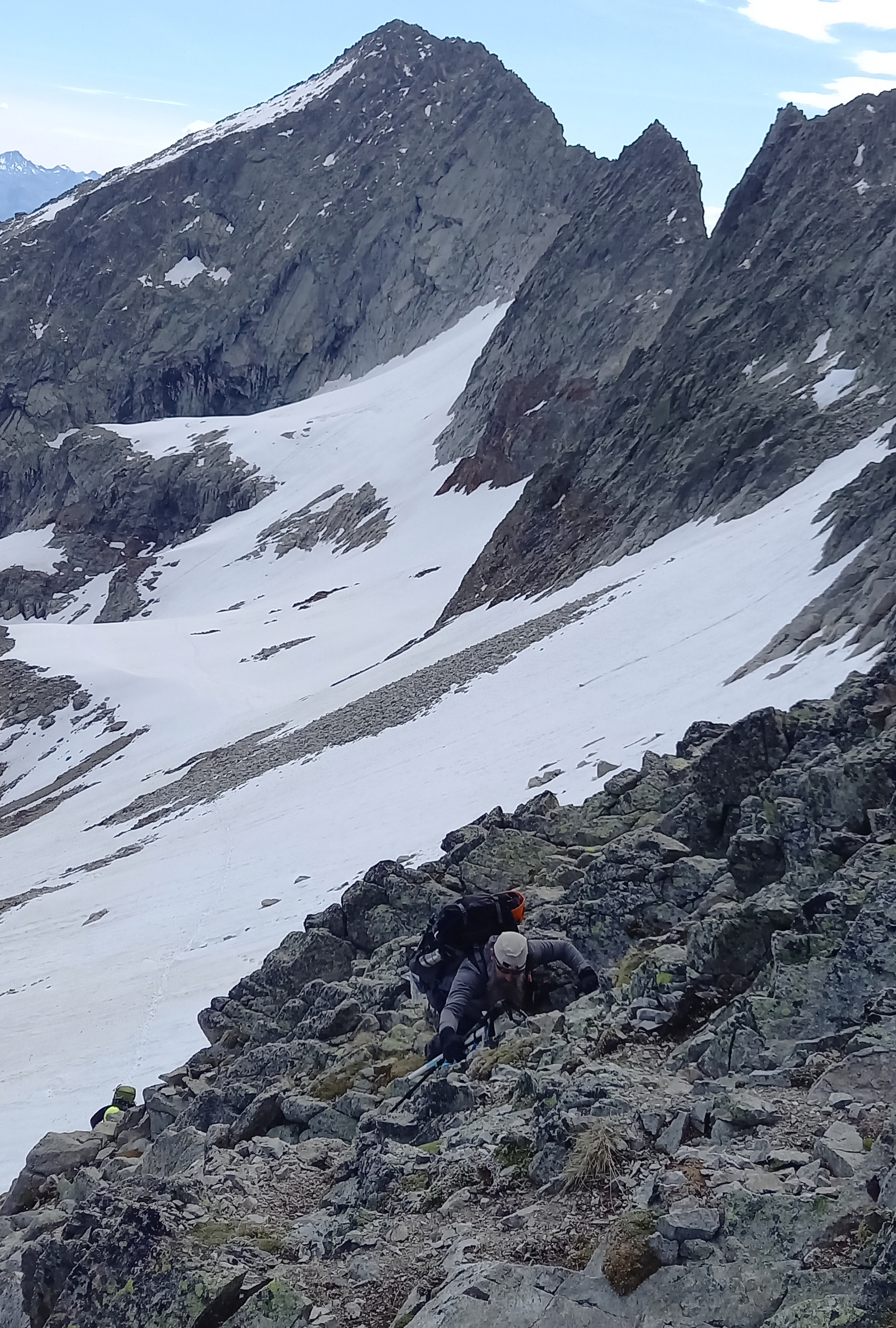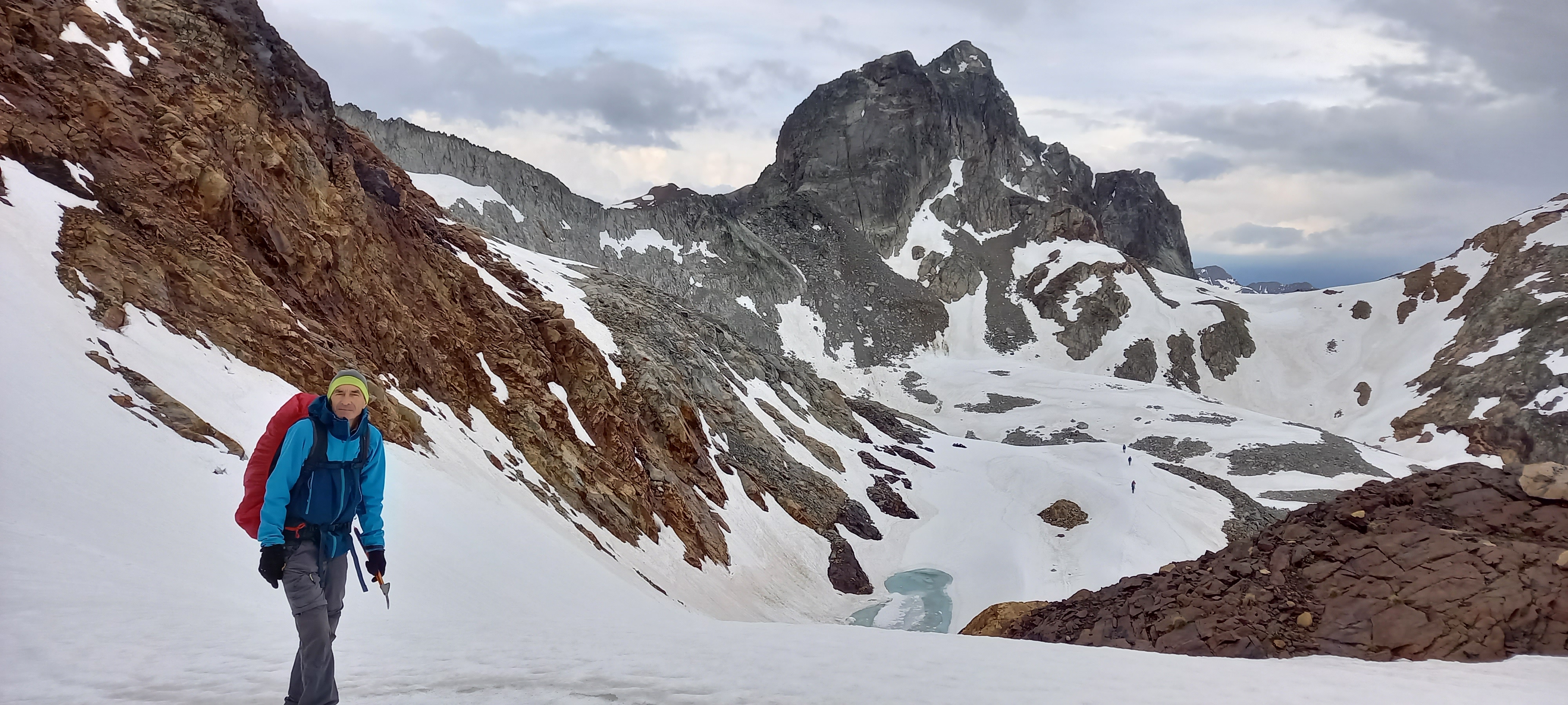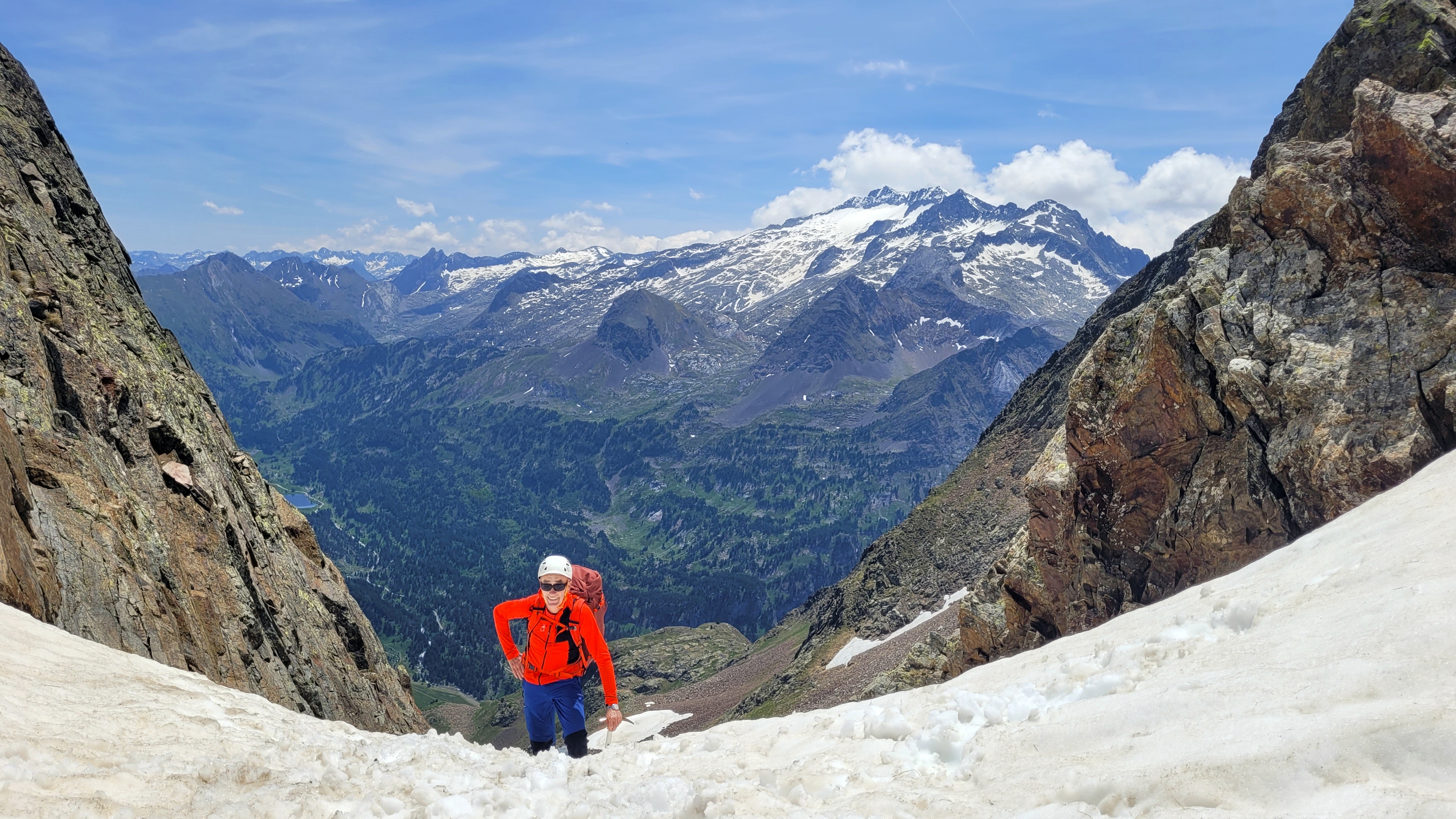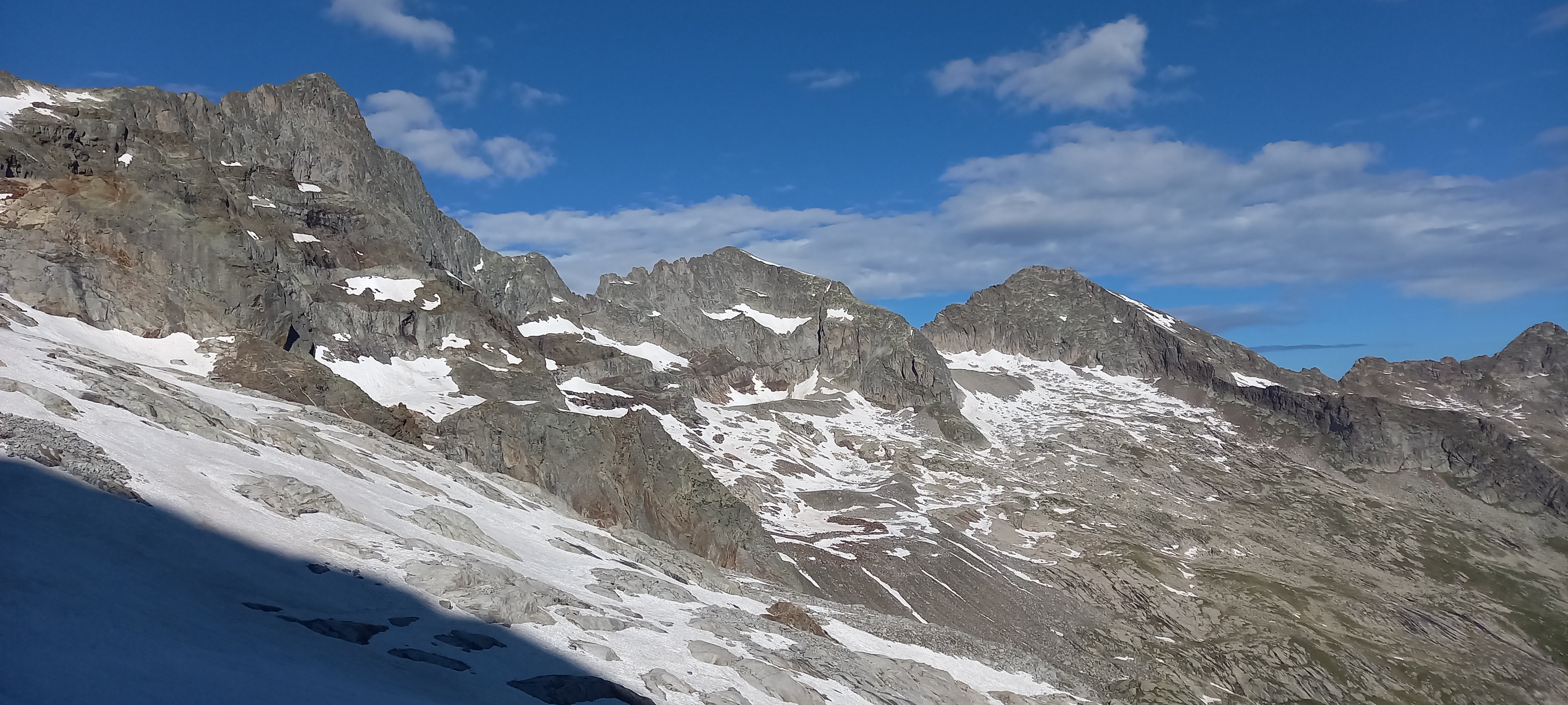 Départ pour les pentes neigeuses et le col des Crabioules (3012 mètres), la vallée et le col de la Literole, puis descente au cirque du Portillon.