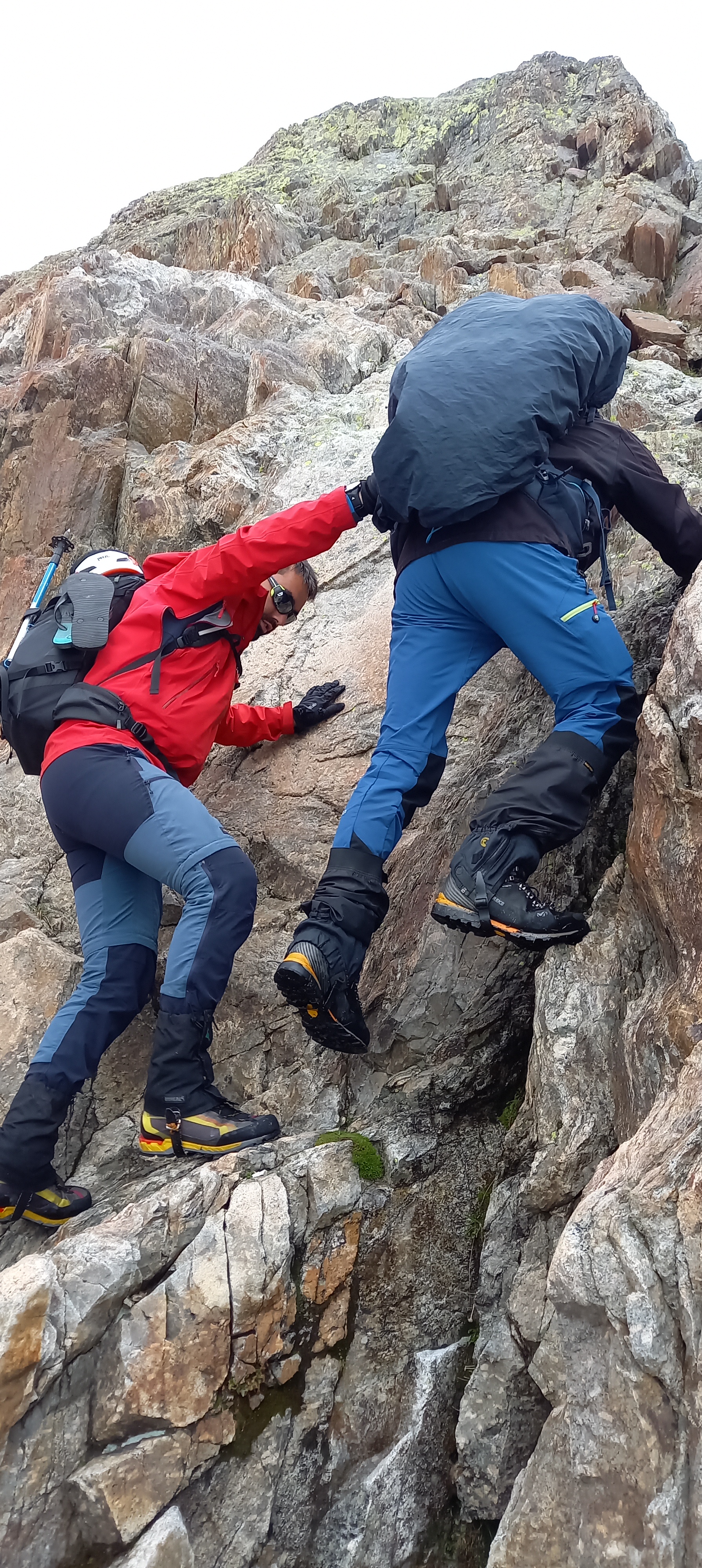 L’histoire de Gilles : il faisait partie du groupe des escaladeurs. Le premier jour il chute de sa hauteur et se fend la main sur une roche acérée. Ça saigne beaucoup, la plaie est profonde, retour d’urgence à Saint Gaudens ou il est opéré le lendemain. Émotion ++ dans le groupe. Heureusement pas de lésion interne. Malgré la fraîcheur de sa blessure, il est venu au refuge d’Espingo avec sa monospace, passer la dernière nuit avec nous. Quand je suis tombé sur lui à son arrivée j’étais si content que je l’ai embrassé. Il nous a bien aidé le lendemain pour les mutations avant le départ. Pour moi, son geste c’est de la fraternité !
